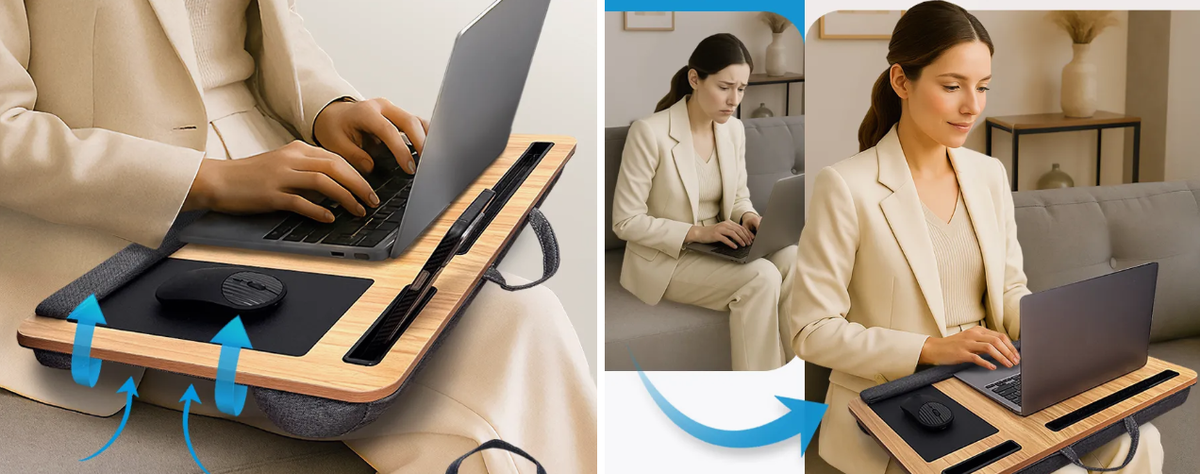 - Подставка для ноутбука: Удобство на новом уровне. С ней использование ноутбука на мягкой поверхности превращается в комфортную работу или просмотр фильмов.