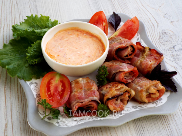 2. Формирование рулетиков: На полоску бекона уложить подготовленные слайсы баклажанов и завернуть в рулетик. Обратите внимание, чтобы все ингредиенты были плотно собраны.