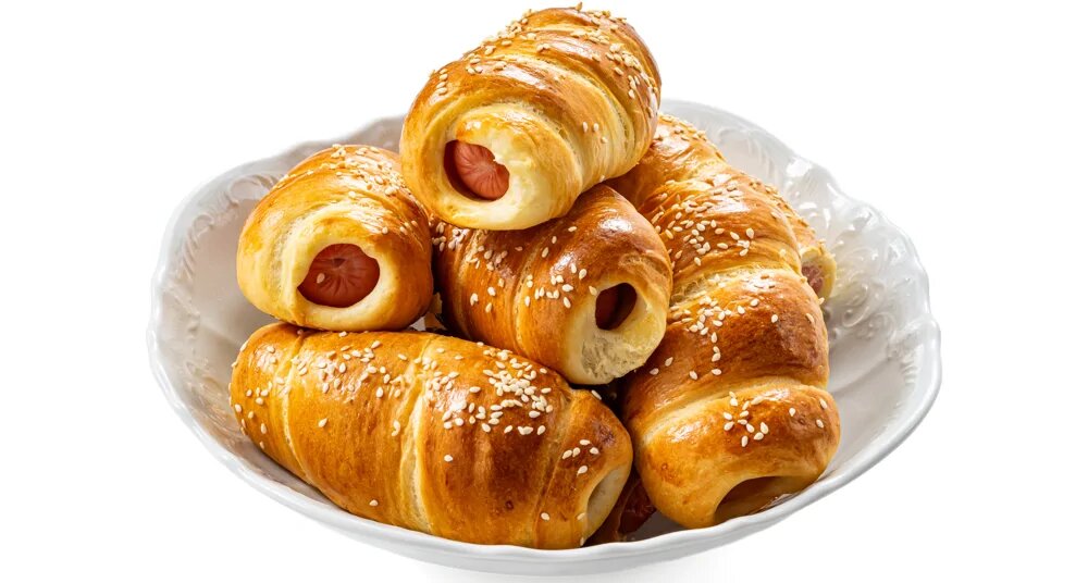 Для блестящей корочки смешать оставшееся яйцо с столовой ложкой молока, смазать тесто и посыпать кунжутом. Выпекать в духовке около 25 минут до золотистого цвета. Готовые сосиски можно подавать как горячими, так и остывшими — в любом случае они исчезнут с тарелок моментально.