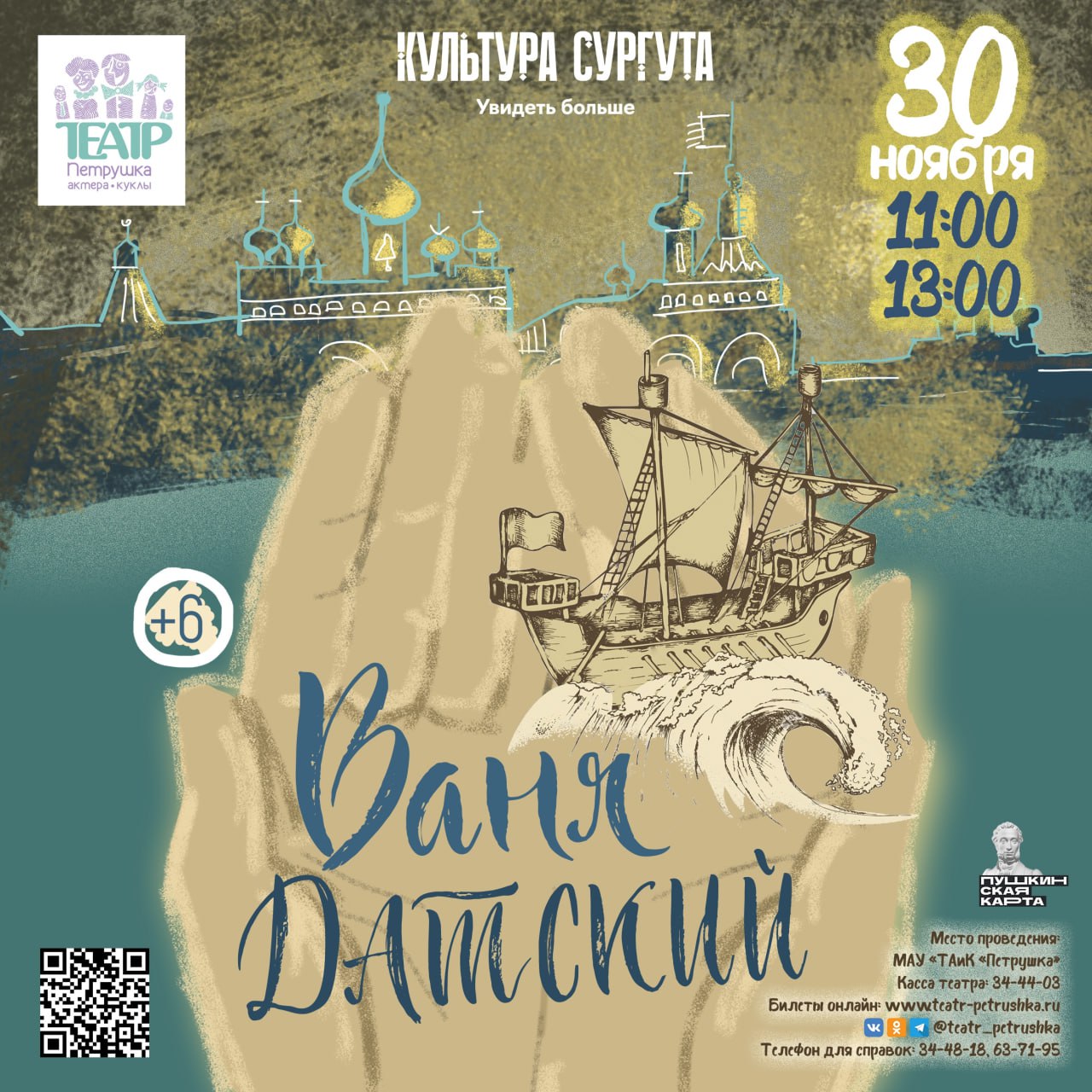В 11:00 и 13:00 Театр актёра и куклы «Петрушка» (ул. Энгельса, 11) приглашает на спектакль «Ваня Датский». Это трогательная притча о сыне, сбежавшем из дома в море, навстречу приключениям. Много раз обошёл он вокруг света, стал настоящим моряком и даже обзавелся семьей в далекой Дании, но все же вернулся на родной берег, где все эти годы его ждала мама.