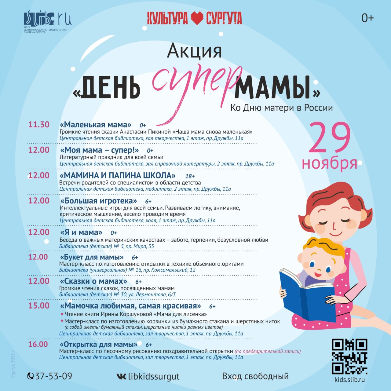 С 11:30 до 16:00 на площадках четырёх городских библиотек пройдет акция «День СуперМамы», посвящённая Дню матери в России.