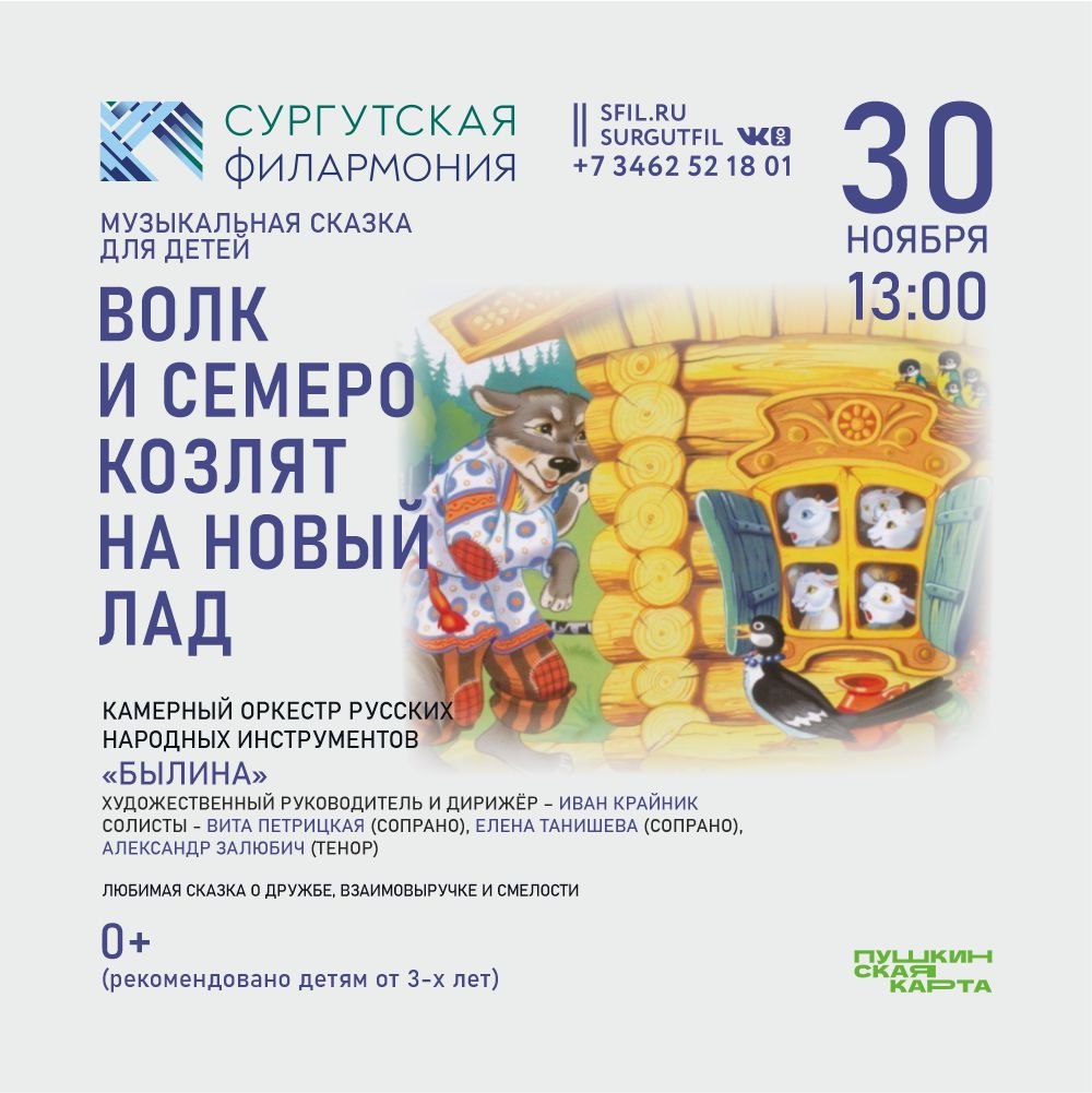В 13:00 Сургутская филармония приглашает юных зрителей посетить музыкальную сказку для детей «Волк и семеро козлят на новый лад» в исполнении Камерного оркестра русских народных инструментов «Былина». Любимая сказка о дружбе, взаимовыручке и о том, как важно слушать маму.