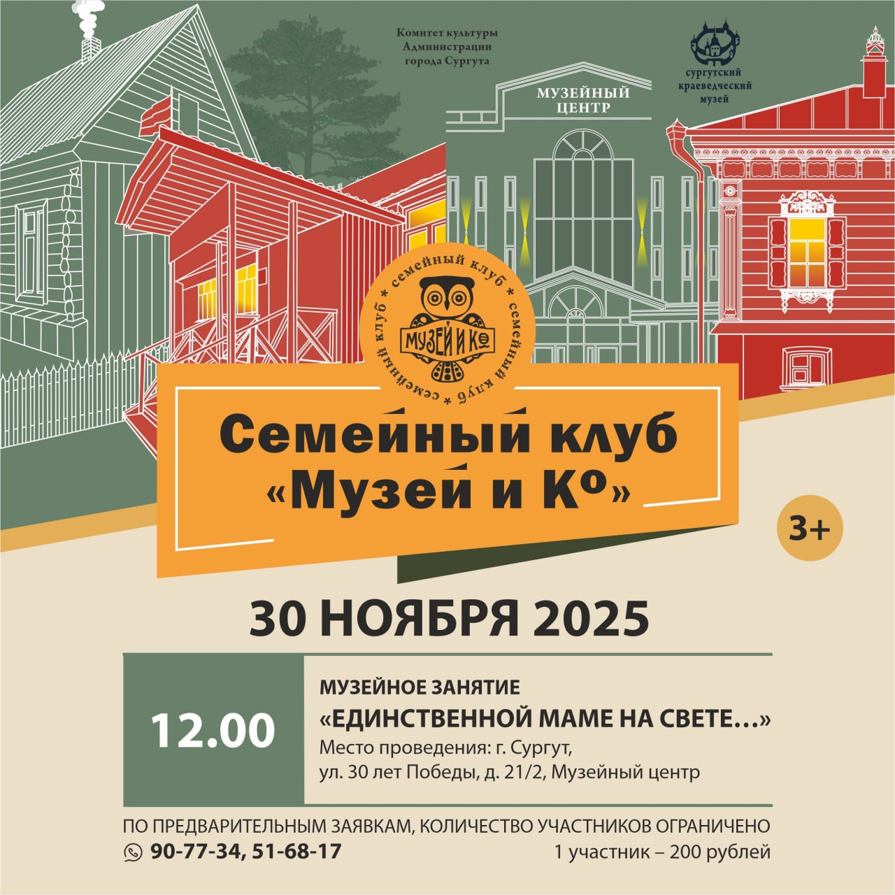 В 12:00 Сургутский краеведческий музей приглашает на музейное занятие «Единственной маме на свете…». Подарок, сделанный своими руками, станет хорошим дополнением к нежным словам, сказанным в этот день. Записаться можно по телефонам: 51-68-17, 90-77-34.