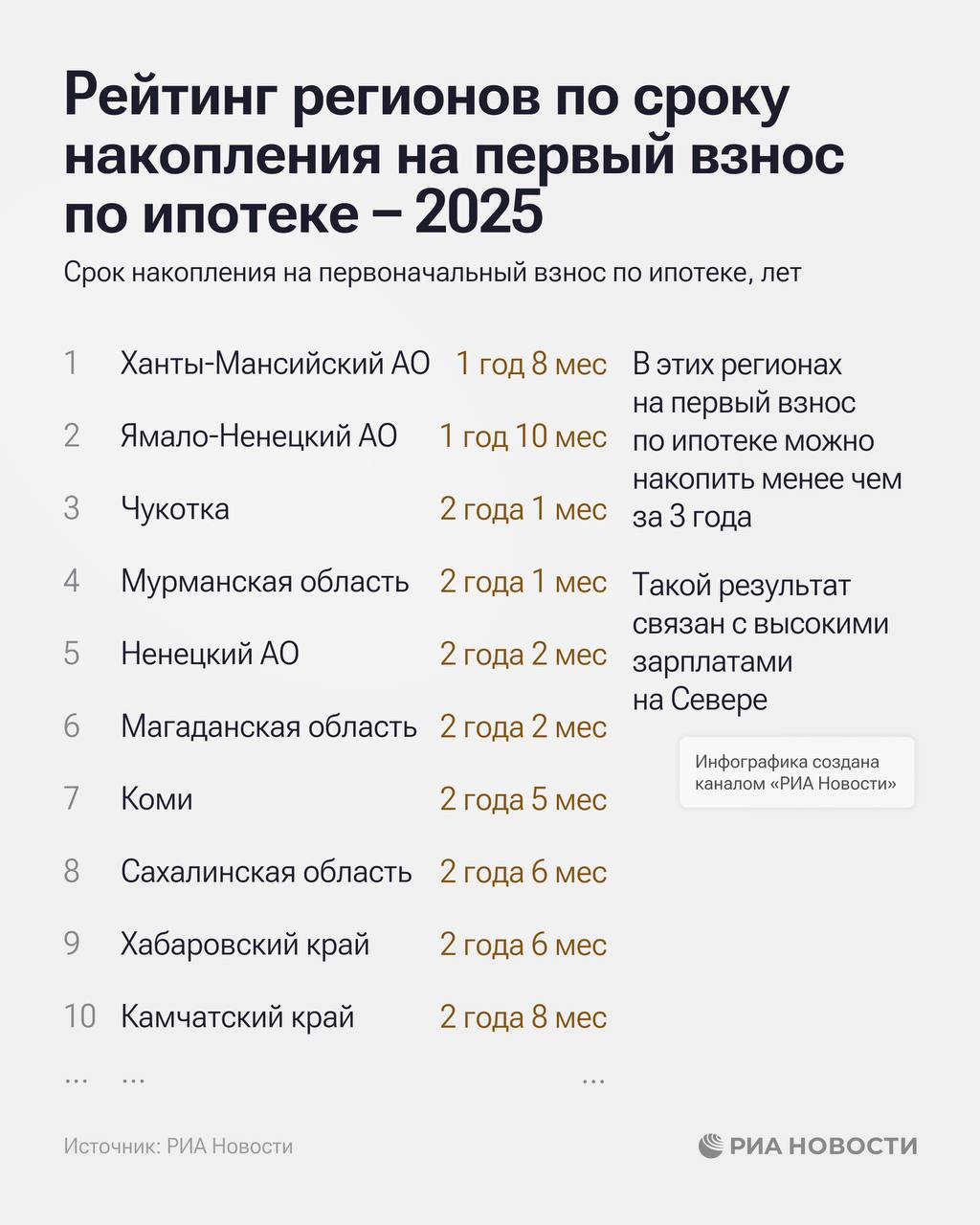 ХМАО, ЯНАО и Чукотка лидируют в рейтинге регионов по сроку накопления на первый взнос по ипотеке.