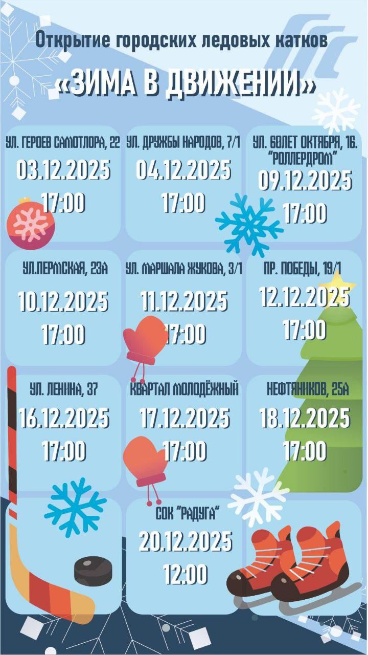 А с 3 декабря еще на трех катках: Героев Самотлора, 22, на Дружбы Народов, 7/1 и на Проспекте Победы, 19/1.