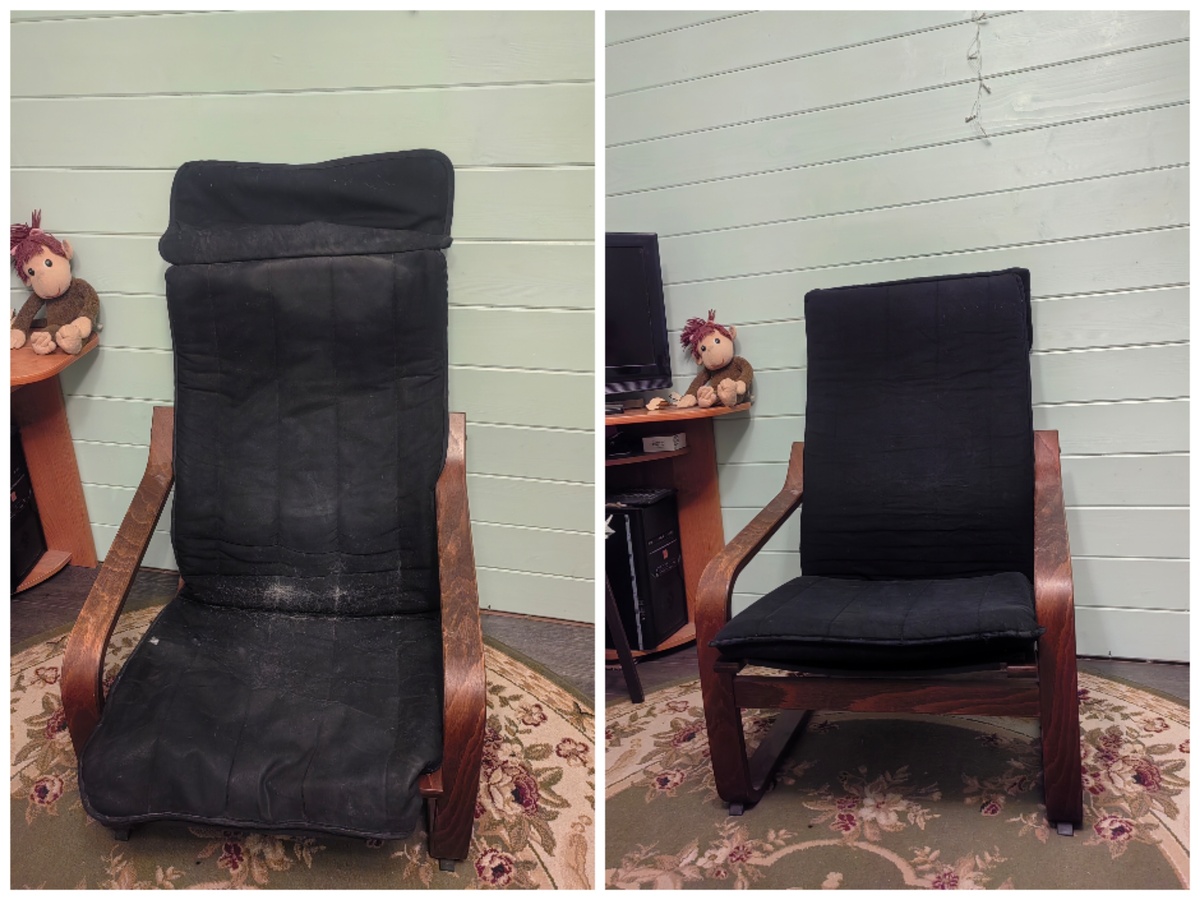 С наступлением новогодних праздников желание обновить эти кресла стало настойчивым. Было решено узреть простое решение: чехлы кресел оказались на молнии, что дало возможность легко снять их и отдать в стирку. Тем не менее, это оказалось не так просто, как планировалось: поролон, которым были наполнены кресла, проявил упорство, и его не так-то легко было извлечь. Главное, что удалось сделать — очистить кресла от следов пищи и загрязнений, вернуть им первозданный вид.