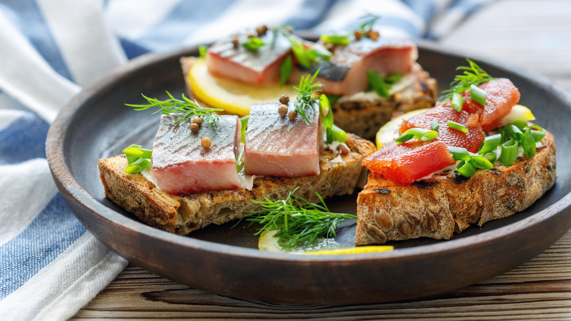 На ломтик багета выложите картофель, огурец и рыбу. Закрепите закуску шпажками с нанизанными помидорами и петрушкой, пишет «Лайфхакер».