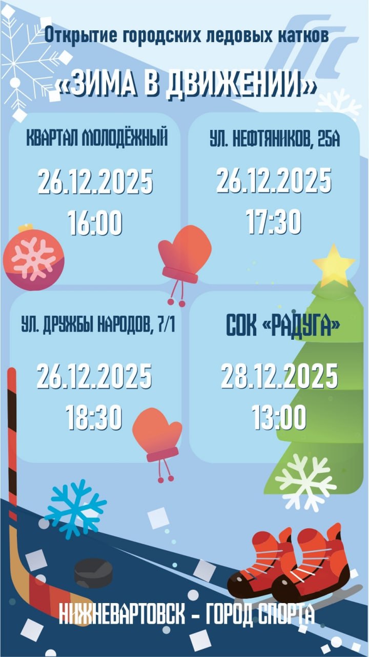 Также 26 и 28 декабря пройдет открытие городских ледовых катков.Жителей и гостей города ждет развлекательная программа "Зима в движении".