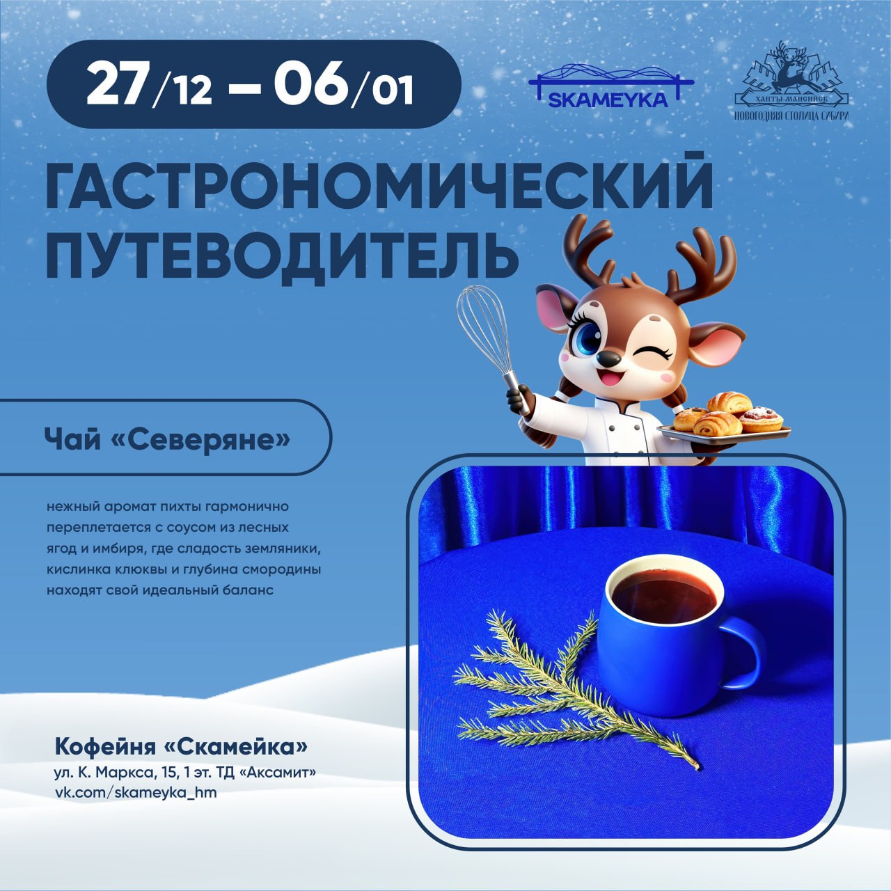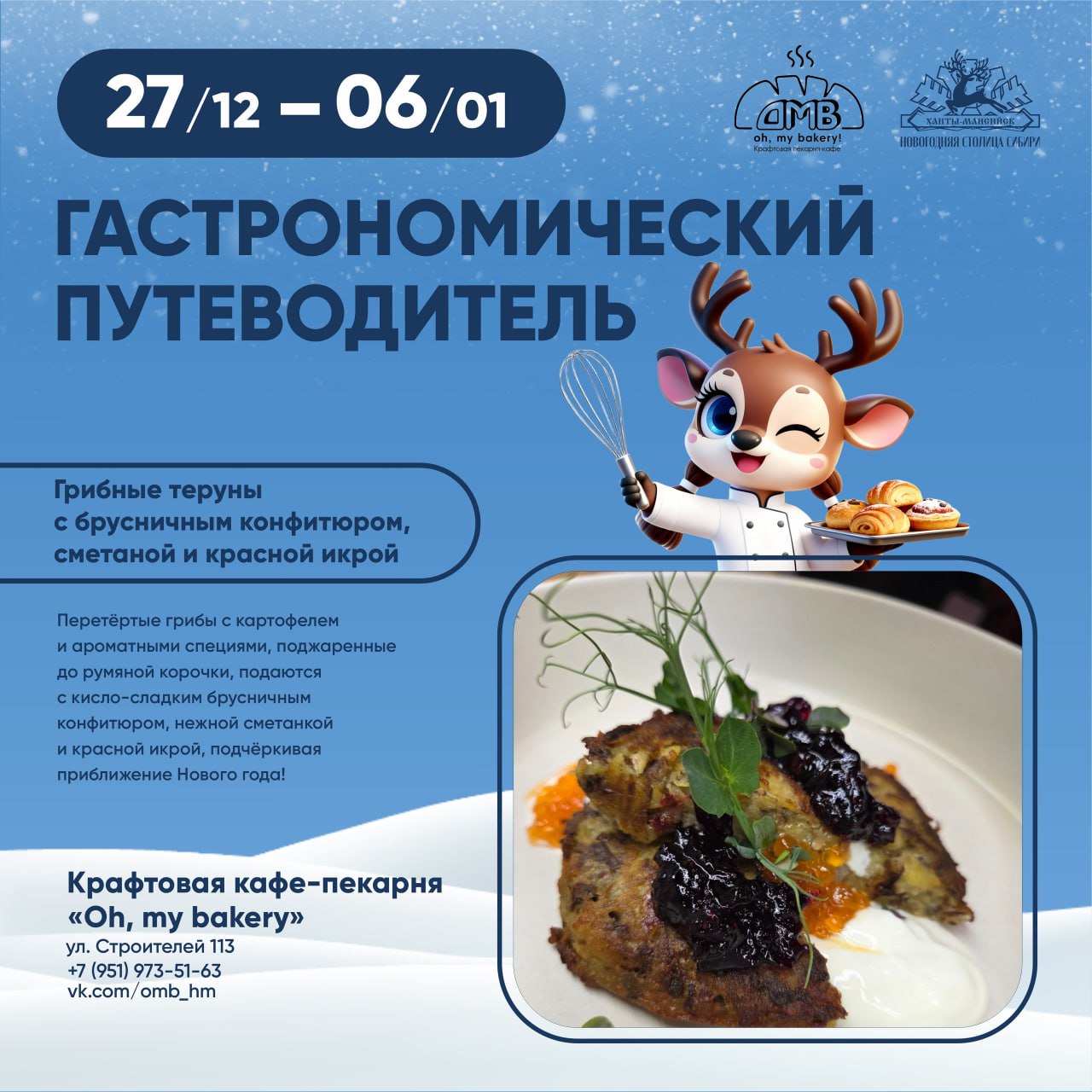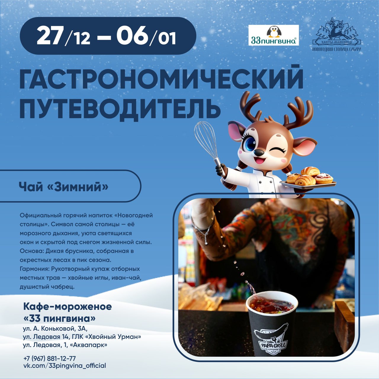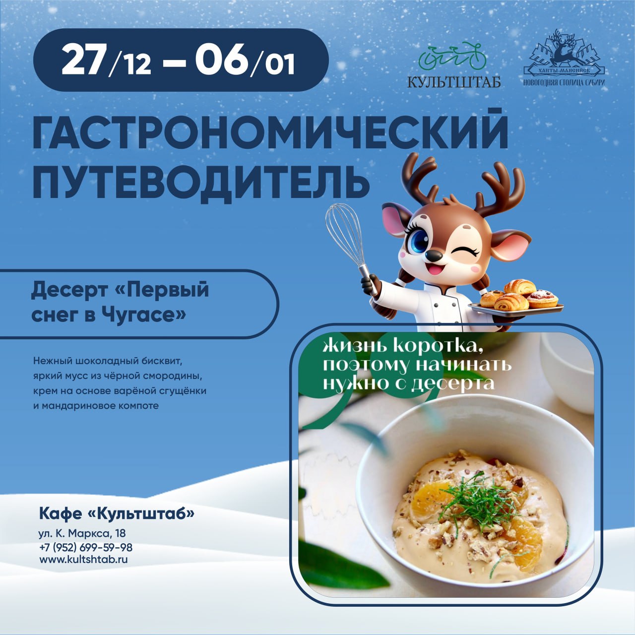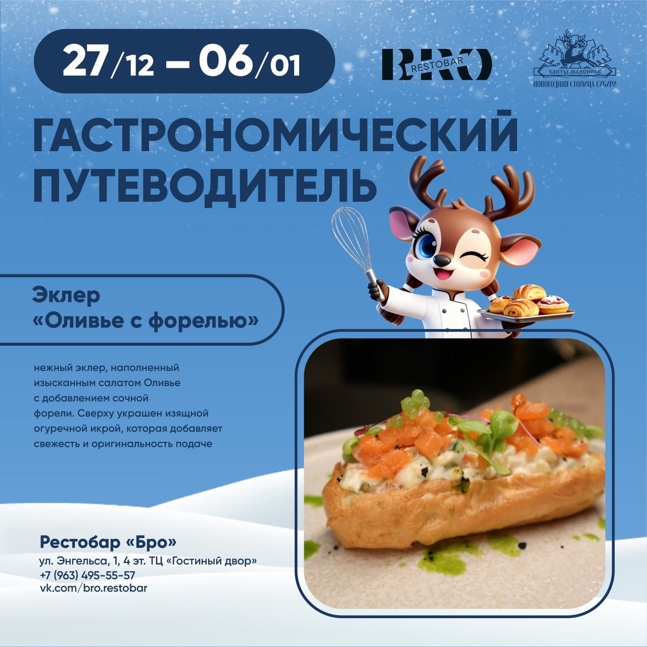 Она пройдёт с 27 декабря по 6 января. Восемь заведений города создали эксклюзивные праздничные хиты. Такие, как кедровый кофе, грибные теруны, оливье в эклере и другие. Задача участника гастронедели - найти свой вкусовой идеал, а ещё лучше – попробовать и оценить каждое блюдо.