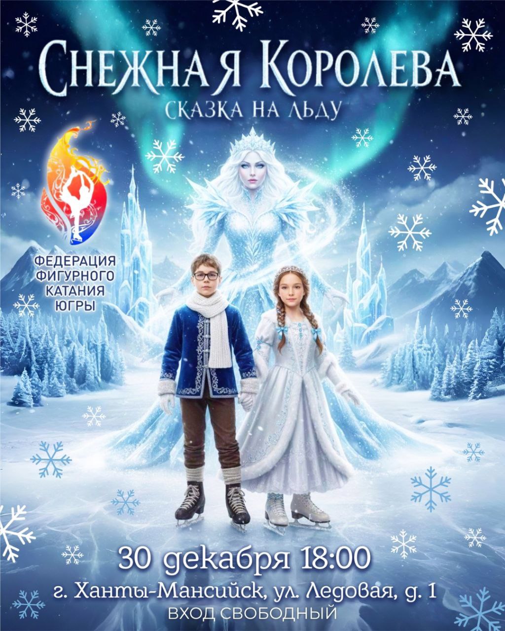 Юные таланты, воспитанники секции Федерации фигурного катания на коньках Югры, приготовили для хантымансийцев новогодний подарок — яркое и трогательное шоу, наполненное грацией и зимним волшебством. Приходите на чудесную ледовую постановку по мотивам сказки Ганса Христиана Андерсена «Снежная королева»