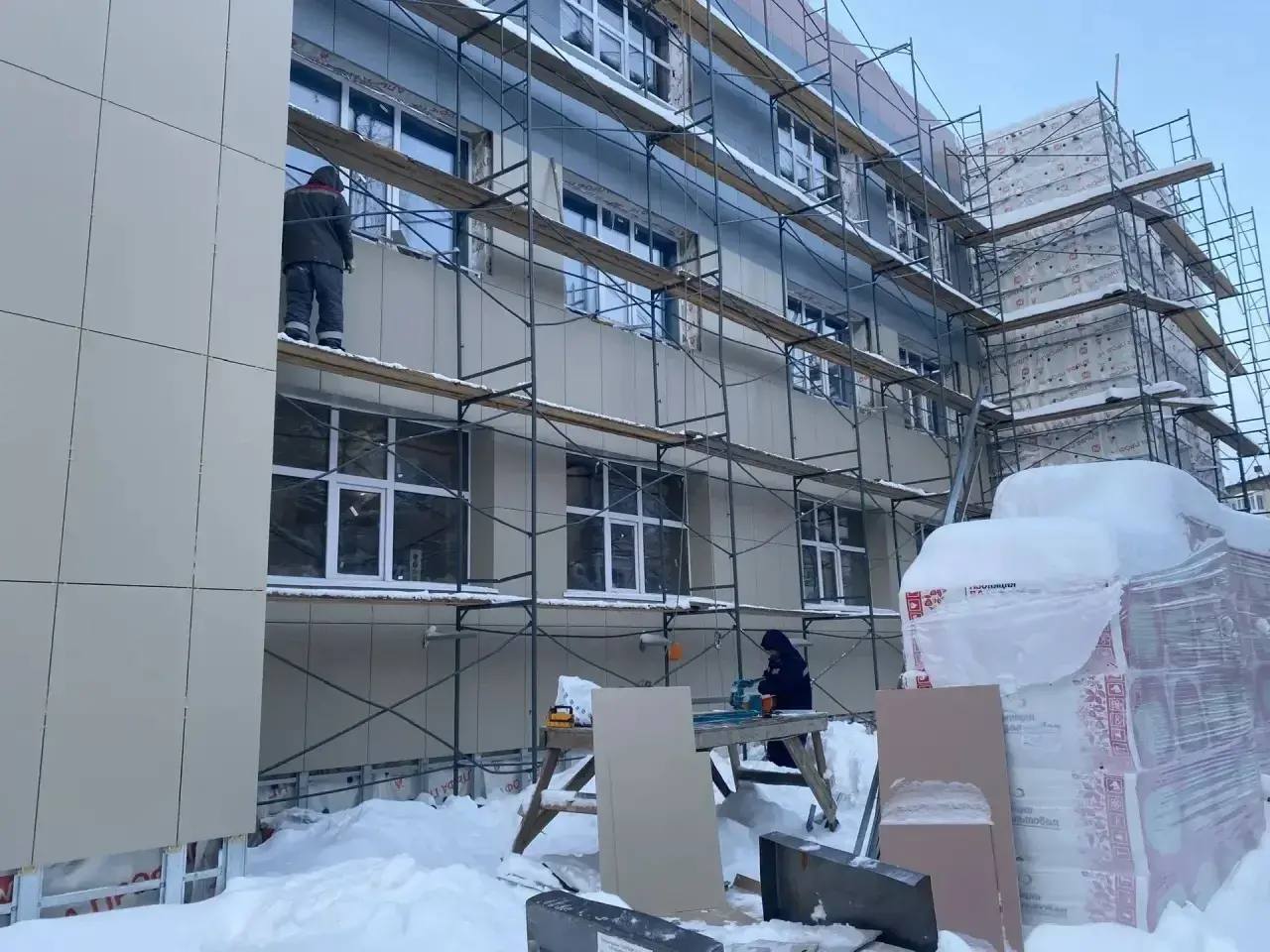 На сегодняшний день работы на объекте ведут 43 человека. Строители занимаются утеплением и отделкой фасада здания, электромонтажными работами, отделкой помещений, прокладкой внутренних сетей водоснабжения, водоотведения, связи и вентиляции. Объект готов на 60%.