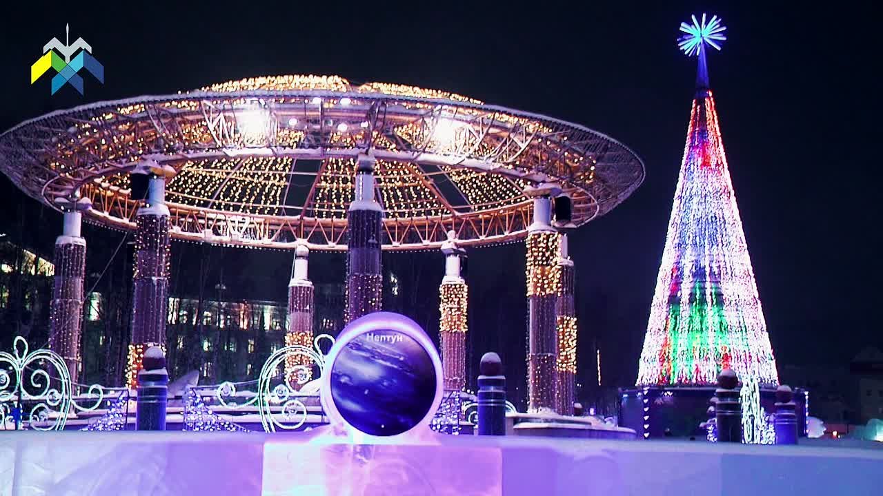 Центральная площадь Ханты-Мансийска готова к встрече Нового года. В этом году данная территория преобразилась в космическое пространство с планетами Солнечной системы и созвездиями.