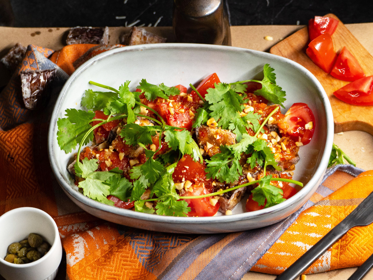 Нарежьте баклажаны крупными кубиками (размером 2-3 см) и замочите их в подсоленной воде на 10-15 минут, чтобы убрать горечь.Мелко нарежьте лук, чеснок и корень имбиря.Сладкий перец нарежьте кубиками размером 2-3 мм, а помидоры — крупнее, как и баклажаны.Измельчите арахис до состояния крошки.На разогретую сковороду добавьте 20 мл растительного масла и обжарьте лук, чеснок, перец и имбирь до мягкости.Вмешайте сладкий чили соус и прогрейте на слабом огне 15-25 секунд — соус готов.Разогрейте масло для фритюра до 160-170 градусов. Обсушите баклажаны и запанируйте их в смеси соли, чёрного перца и кукурузного крахмала.Обжаривайте баклажаны в горячем масле 1-1.5 минуты до золотистой корочки. Выложите их на бумажное полотенце, чтобы избавиться от лишнего жира.Соберите салат: на тарелку выложите жареные баклажаны, добавьте помидоры, полейте соусом и посыпьте крошеным арахисом. Украсить свежей кинзой.Приятного аппетита!