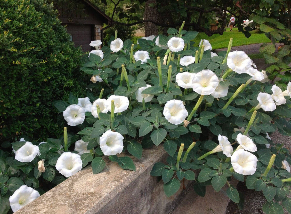 Дурман трубадур — это роскошный кустарник с крупными белыми цветами в виде колокольчиков. Он славится своей способностью к самосеву и минимальными требованиями к уходу. Даже в условиях неплодородных почв это растение выдерживает засуху и не нуждается в дополнительных подкормках.