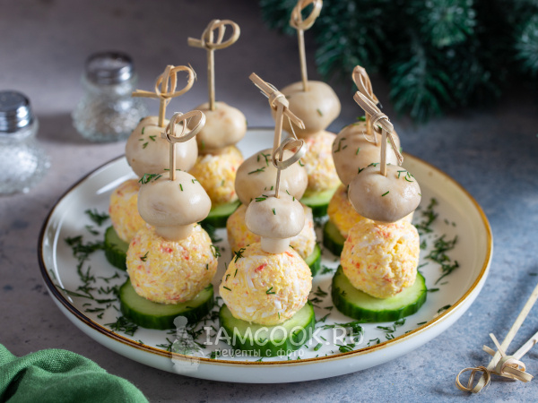 - Канапе с грибами и сыром: комбинируя крабовые палочки с маринованными шампиньонами, свежими огурцами и тертым сыром, можно создать необычное сочетание вкусов, которое придется по душе вашим гостям.