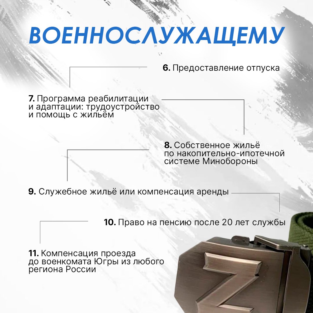 Служба – это ответственность не только перед страной, но и перед теми, кто ждёт дома. В Югре предусмотрены меры поддержки для военнослужащих и их семей: от медицинской помощи и жилищных вопросов до поддержки семьи и детей. Подробности – в карточках.