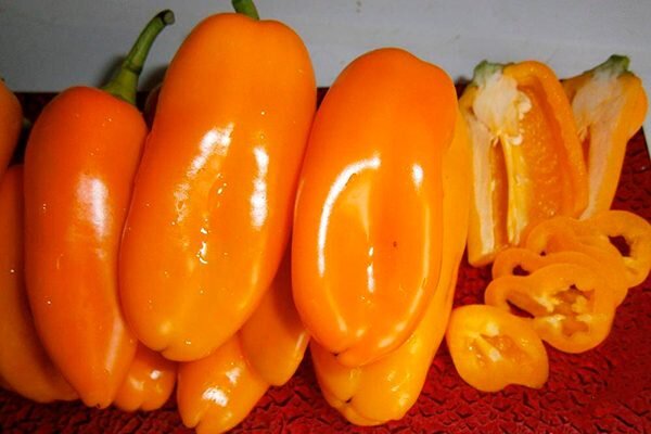 Плоды аппетитно желтого и красного оттенков в форме цилиндра достигают длины 5-10 см и веса около 40 г. Внутри они удивляют своей сладостью благодаря высокому содержанию сахара и витаминов.