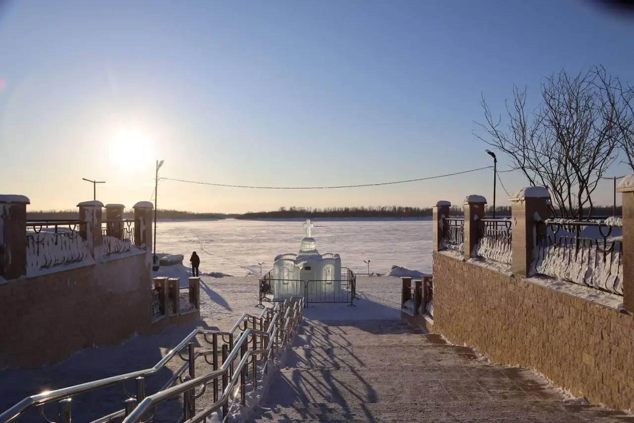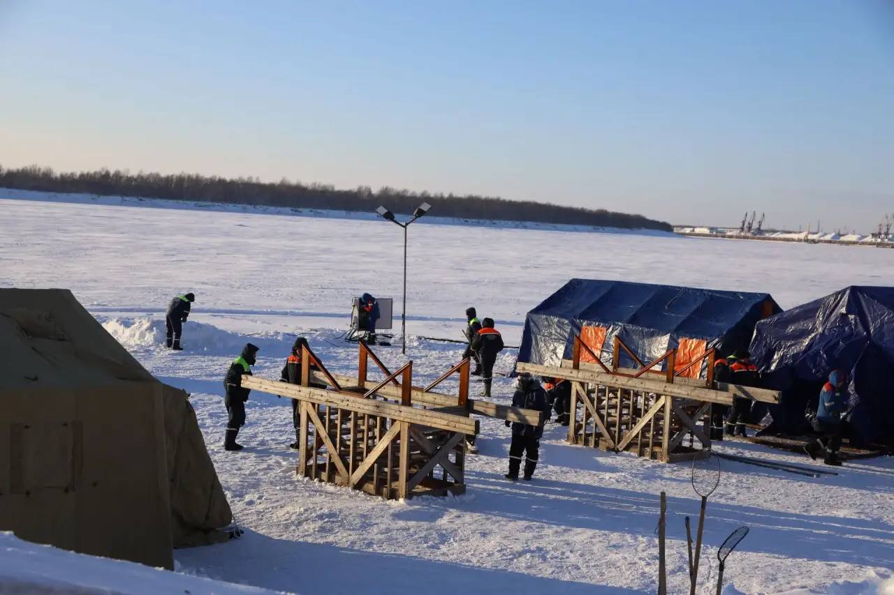 На реке Оби к празднику подготовили две купели, ступени и перила для безопасного спуска, установлены теплые палатки для переодевания.