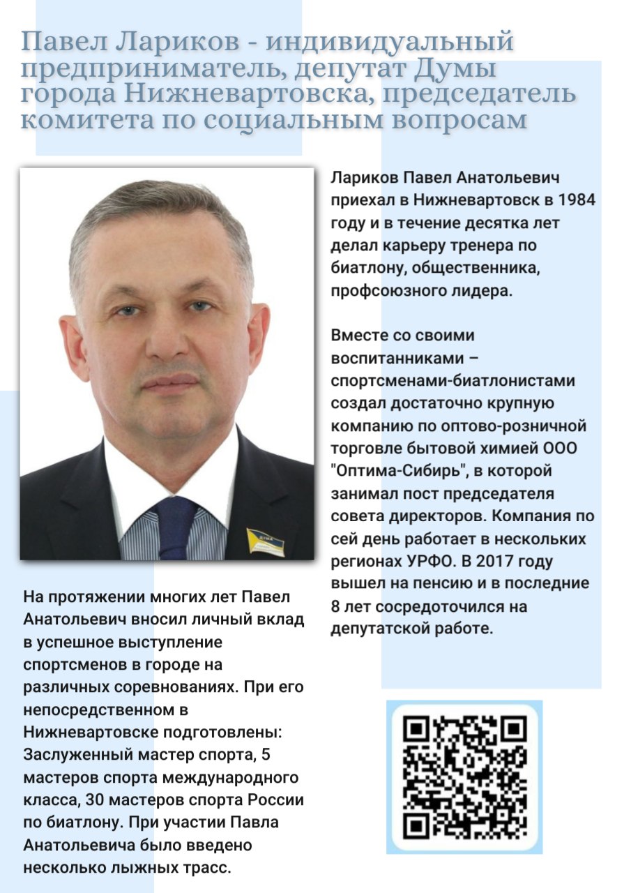 Лариков Павел Анатольевич - индивидуальный предприниматель, депутат Думы города Нижневартовска, председатель комитета по социальным вопросам.