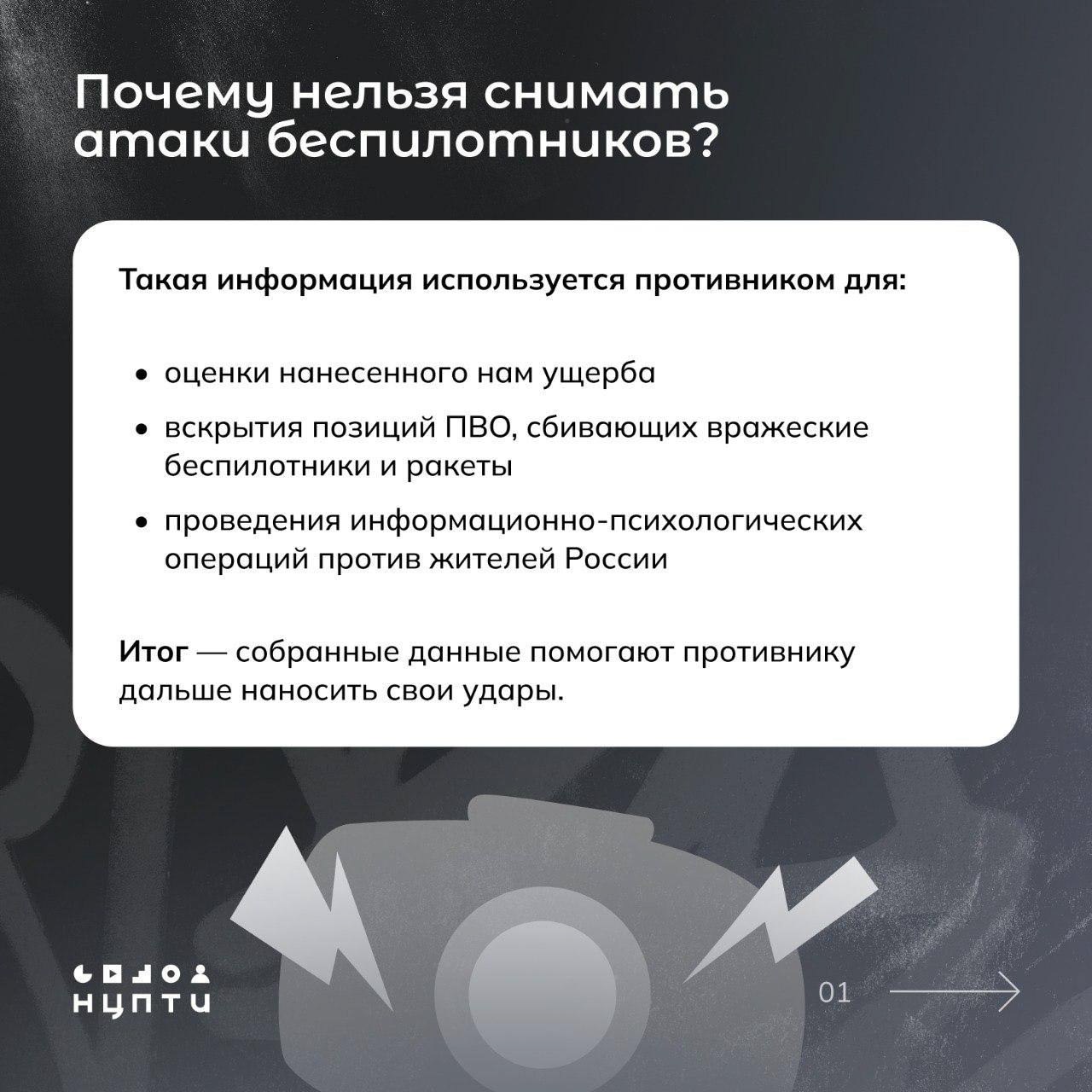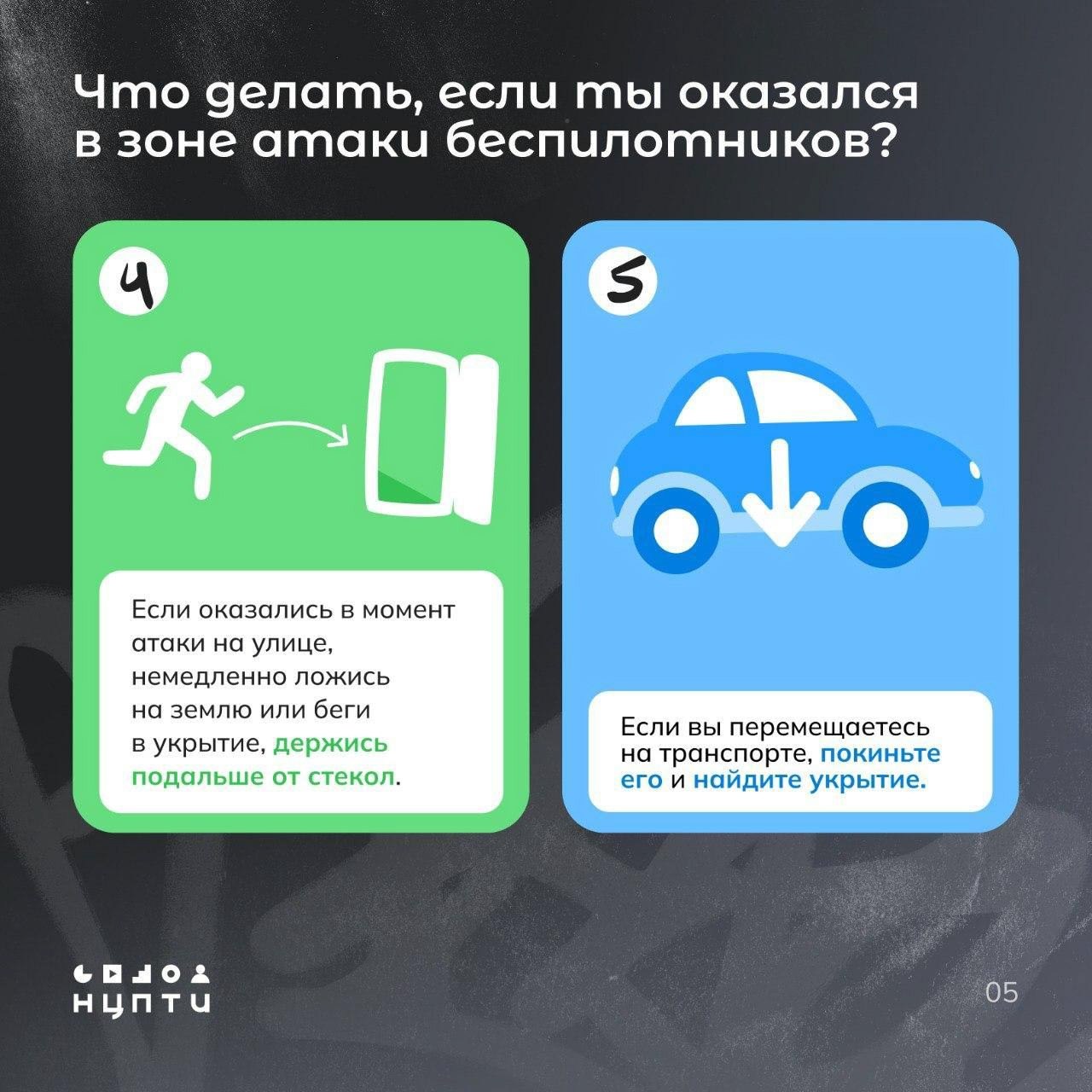Специалисты Национального центра информационного противодействия терроризму и экстремизму в образовательной среде и сети Интернет в карточках разъясняют действия в ситуации, связанной с атакой беспилотных воздушных судов