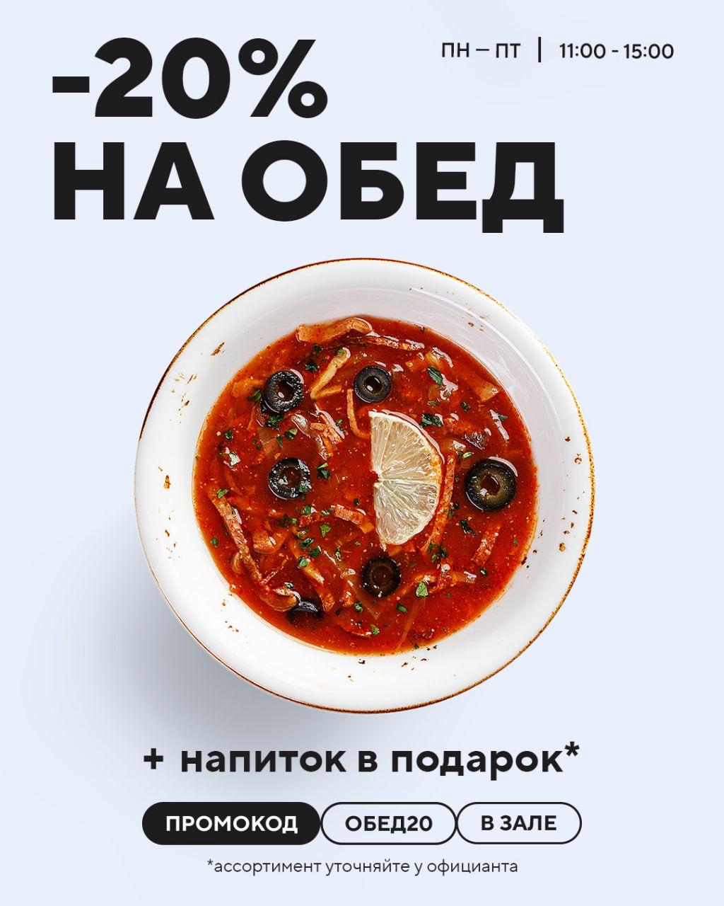 Назовите промокод ОБЕД20 при оформлении заказа. Акция действует с понедельника по пятницу.