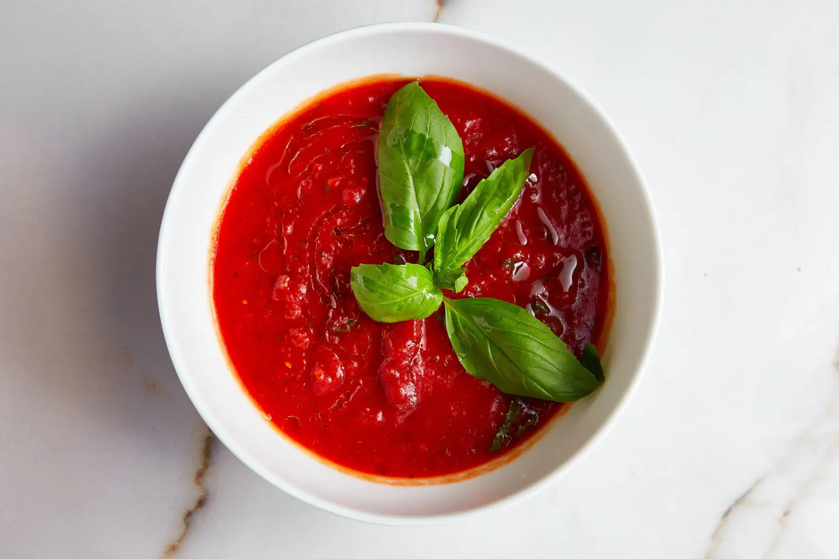 Главное здесь — простые ингредиенты: красные помидоры, лук, чеснок, базилик и щепотка масла. Вкус держится на балансe солёного и лёгкой кислинки томатов, дополненной зеленью и ароматом чесночного шагающего акцента.