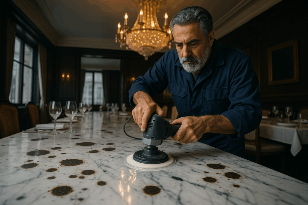 Утро в зале сменяет вечерний блеск столешницы, но следы жизни ресторана остаются дольше, чем кажется: жидкость, тепло и красящие вещества постепенно пронизывают поры мрамора и становятся заметными к концу дня. В обычной кухне мрамор выглядит солидно, пока не возникают пятна и рябь от использования — тогда нужен спокойный, последовательный подход к защите поверхности.