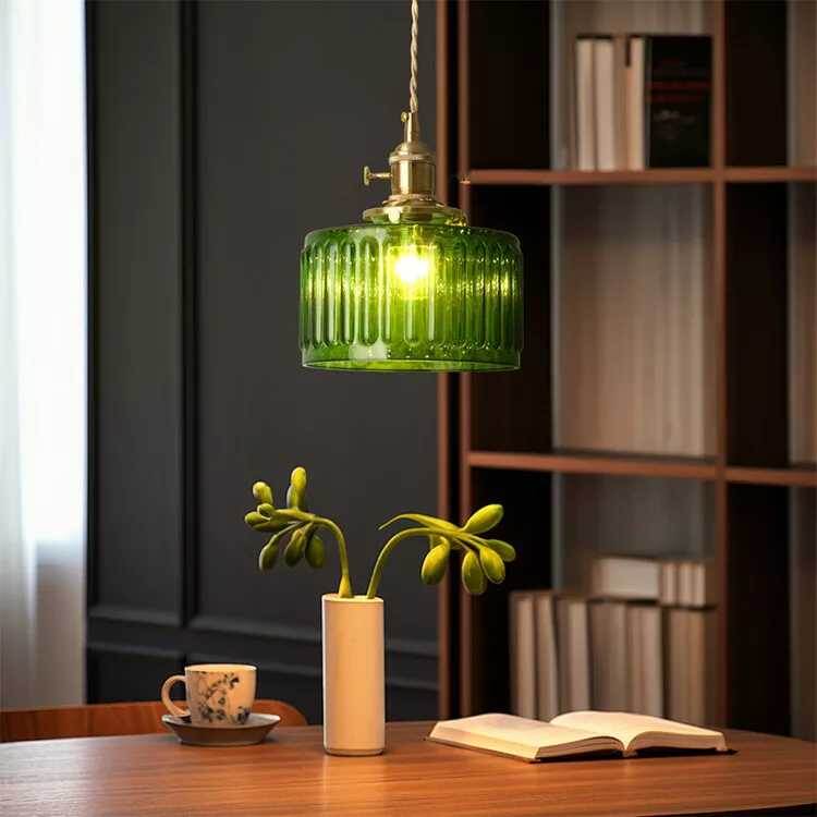 Подвесной светильник в форме ребристого стекла подчёркивает ретро-настрой, подходящий над столовой зоной или кухонным островком. Простота и уверенность линий делают его актуальным даже сейчас.