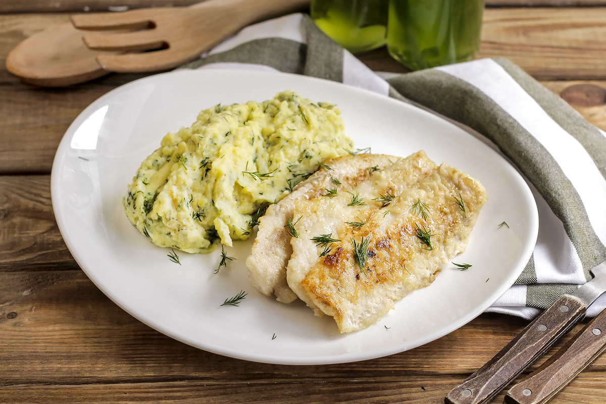 Готовое пюре соедините с укропом и чесноком, посолите по вкусу. Подавайте рыбу с пюре и зеленью, и наслаждайтесь спокойным вкусом домашнего ужина.