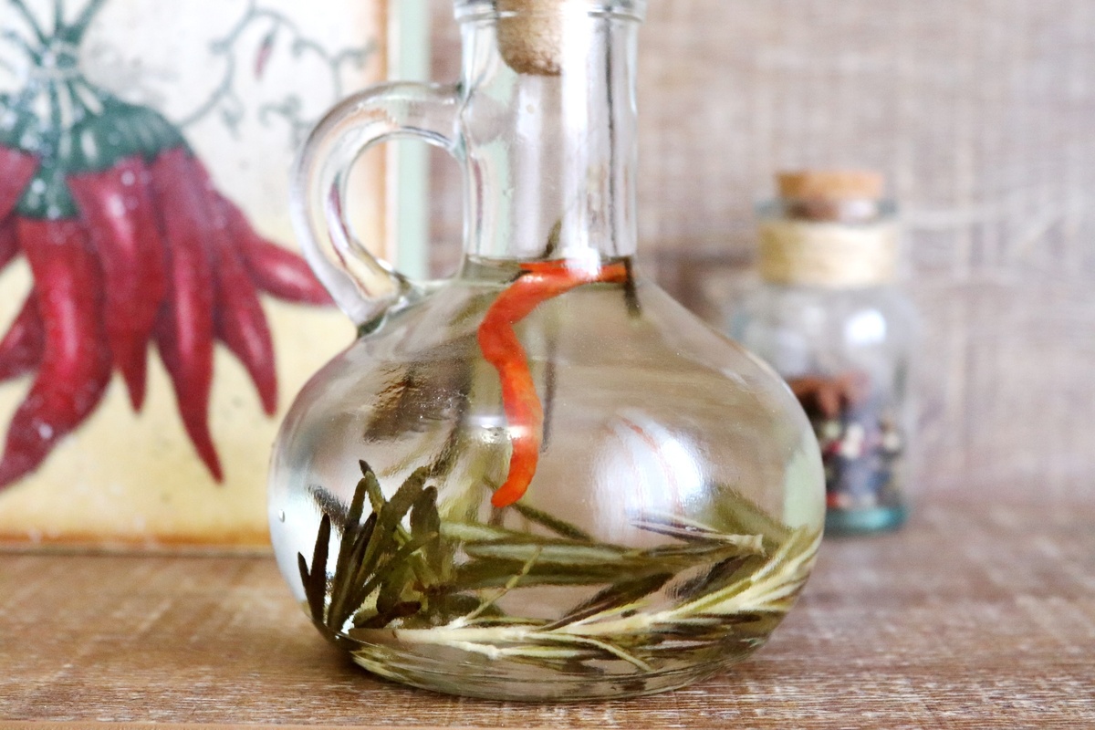 Чтобы получить ароматный уксус, достаточно базовых ингредиентов и немного терпения. В емкость кладут уксус 9%, розмарин и чили, плотно закрывают и отправляют в темное место на 10–14 дней. Уже через несколько дней возникает приятное предчувствие вкуса и аромата, который затем станет заметным в блюдах.