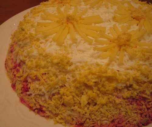 Третий слой — отварная свекла с чесноком и небольшим количеством майонеза. Четвёртый — натёртая на крупной терке морковь, тоже с майонезом. Пятый слой — тонкий слой тёртого сыра, выбор которого зависит от настроения — от нейтрального до немного остро-ароматного. Сверху салат можно украсить натёртым яйцом и легким слоем сыра, как в домашнем видеоролике.