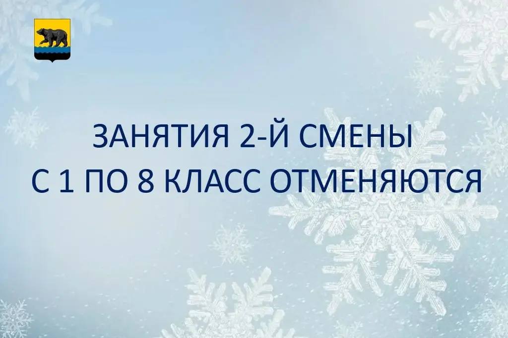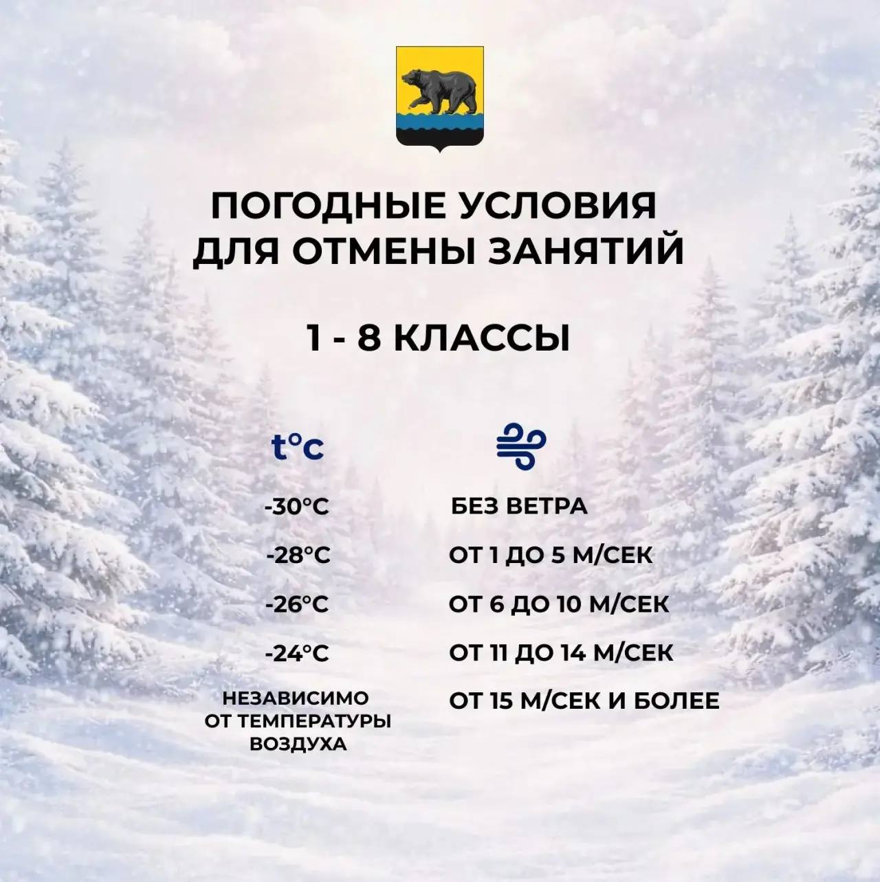 Актированный день. 31.01.2026 на территории города Нефтеюганска во 2 смену значения показателей метеорологических явлений рекомендованы, как неблагоприятные для посещения учащимися 1- 8 классов общеобразовательных учреждений