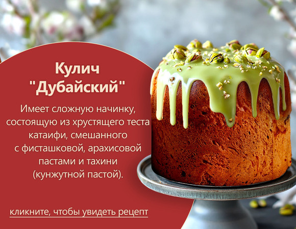 Приветствуем три кулинарных шедевра: волшебный «Дубайский» кулич с восточными ароматами, восхитительный «Синнабон» с корицей и задорным вкусом, а также эффектный «Красный бархат», который станет настоящей звездой настольного оформления. Приготовьте их с любовью и создайте незабываемую атмосферу праздника!