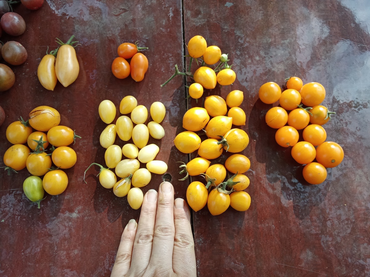 - Гибрид 'Оранжевый фонтан' F1 — эти томаты только начинают созревать, так как пришлось их пересаживать. Плотные и устойчивые к трещинам, но вкус пока немного пресноватый.