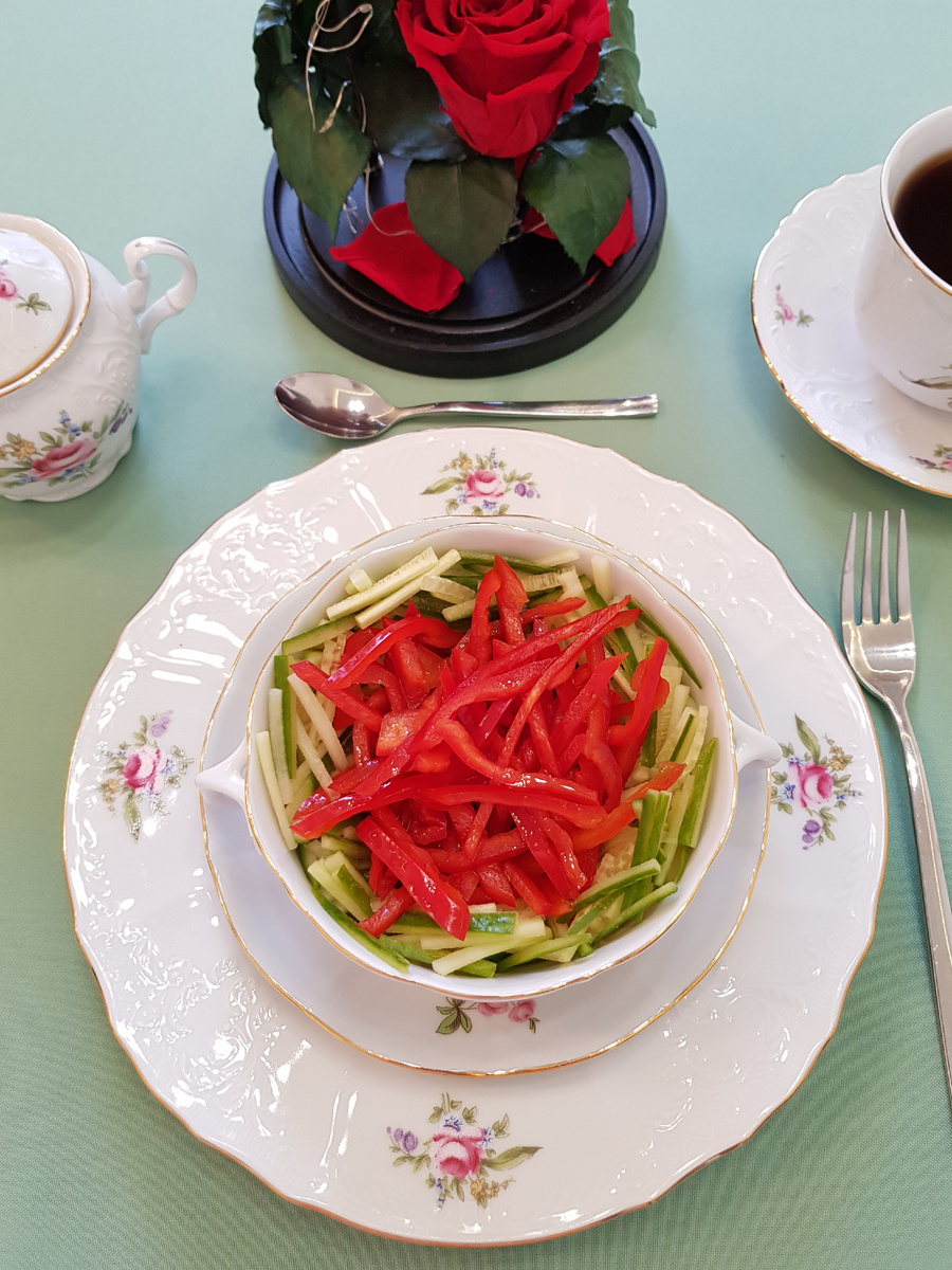 Далее нарежьте огурцы также соломкой и разложите по салатникам. В центр каждого блюда выложите нарезанный сладкий перец.
