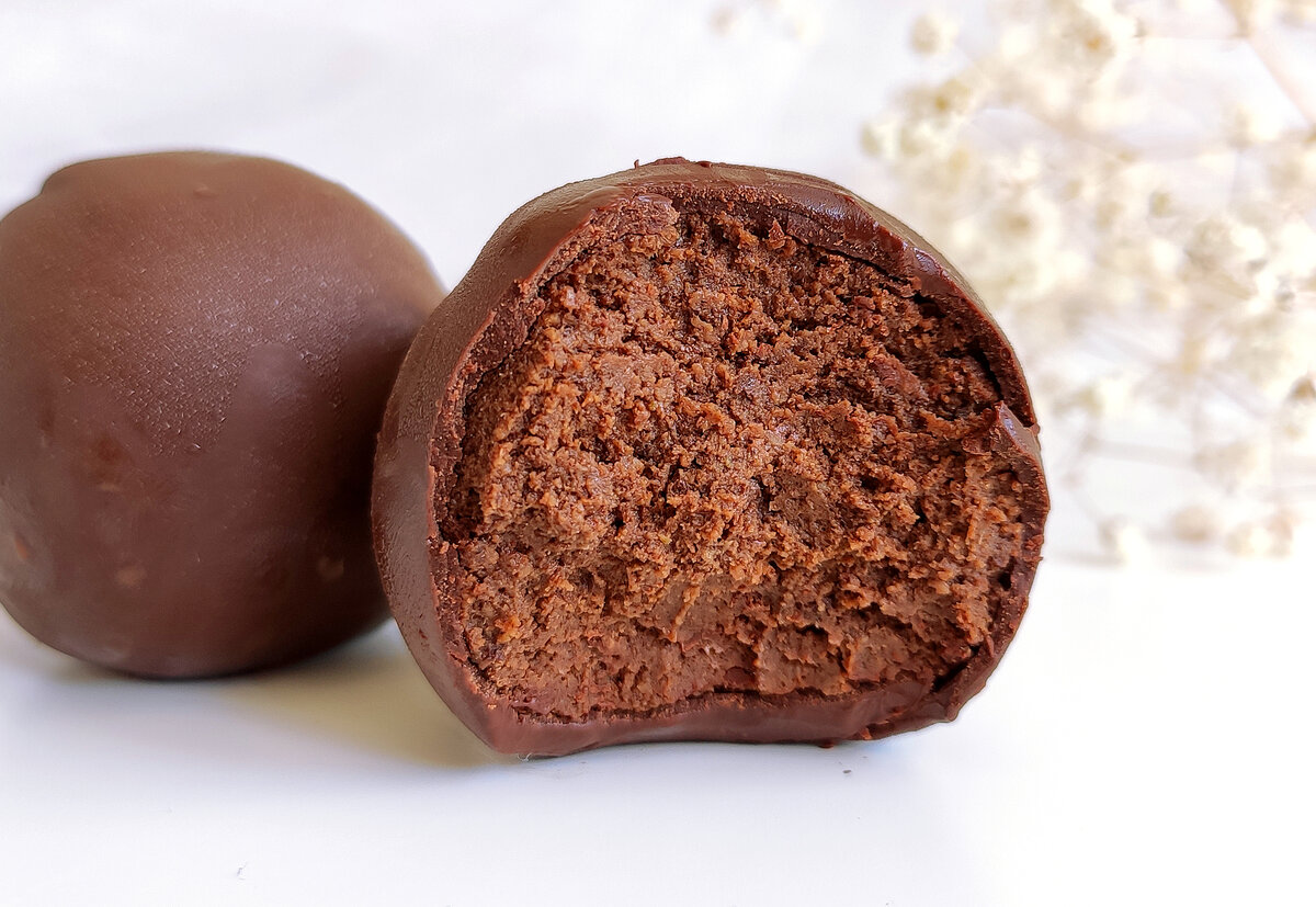 Окуните замороженные шарики в глазурь и дайте стечь. Выложите на плоскую поверхность и охладите в холодильнике около часа. Для предотвращения прилипаний рекомендуется посыпать пирожные какао-порошком.