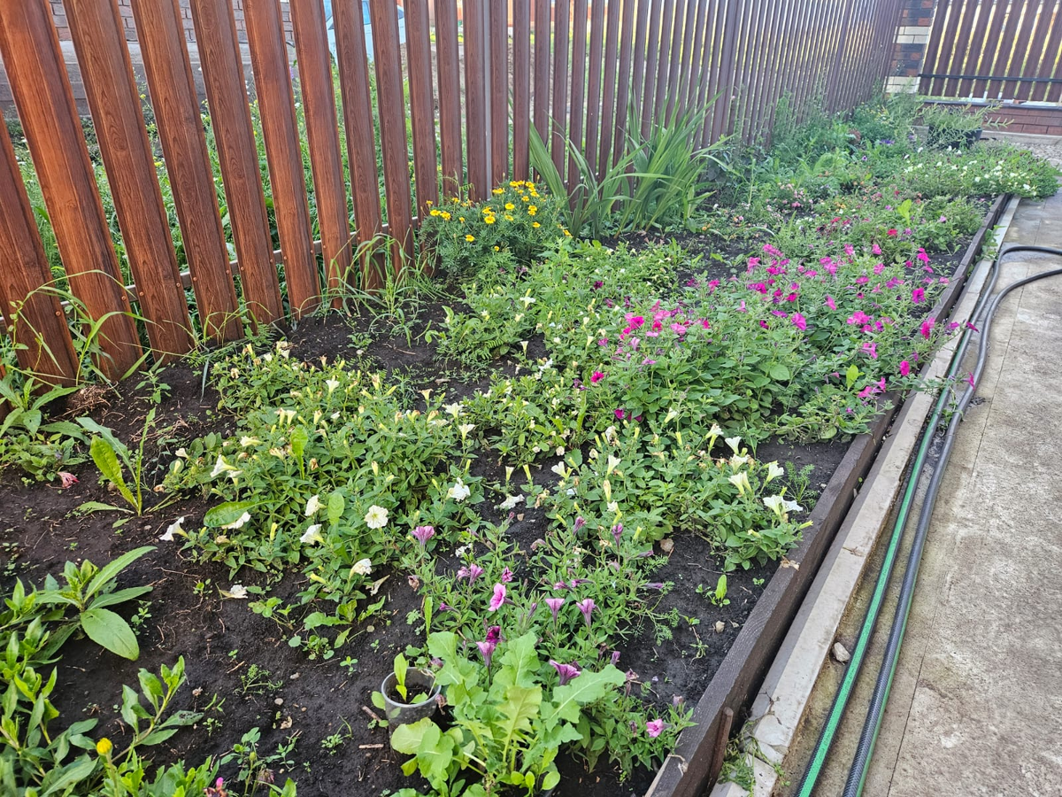 На участке, где в прошлом году петунии украсили цветущий ковёр, сейчас наблюдается печальное зрелище. Непривлекательные цветы и неблагоприятная погода сыграли злую шутку с клумбой. В этом году целью стало создание нового дизайна: одна часть будет засажена плодовыми кустарниками, а вторая — многолетниками, такими как гортензии.