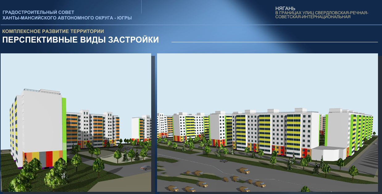 Нягань (в границах улиц Свердловская – Речная – Советская – Интернациональная) — на месте аварийного и ветхого жилья строители возведут пять домов на 500 квартир площадью порядка 25 тысяч «квадратов», а также проложат к ним инженерные сети. Здесь благоустроят игровую и спортивную площадки.
