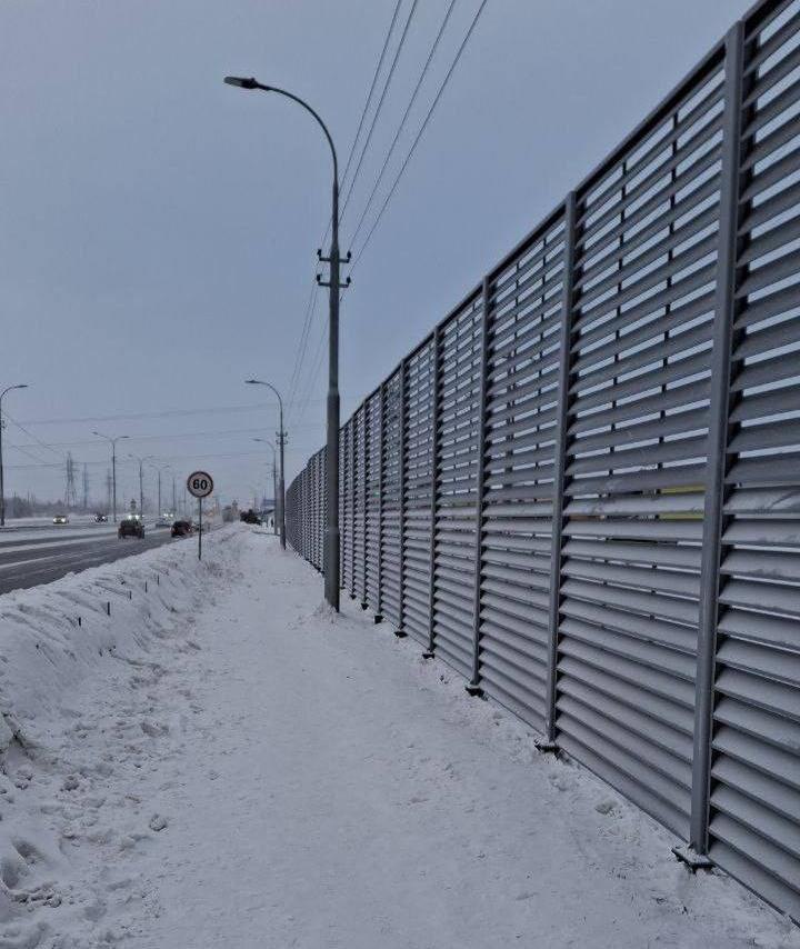 Конструкции смонтированы на двух участках от улицы Показаньева до Заячьего острова. Высота панелей 4 метра, общая длина около 300 метров. Основная цель улучшить эстетический вид важной транспортной артерии. Ограждение выполнено в реечном, проницаемом формате. Это позволяет снегу пролетать сквозь него, предотвращая образование сугробов на проезжей части. Такие конструкции также обладают меньшей парусностью, лучше переносят ветровые нагрузки и не создают у водителей ощущения замкнутого пространства.