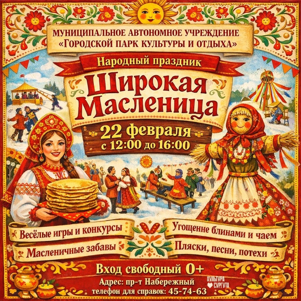 Также в этот день с 12:00 до 16:00 Городской парк культуры и отдыха (проспект Набережный) приглашает горожан на задорное народное гуляние «Широкая Масленица», где также запланированы концерт творческих коллективов, весёлые игры, розыгрыши призов и угощение горячим чаем.