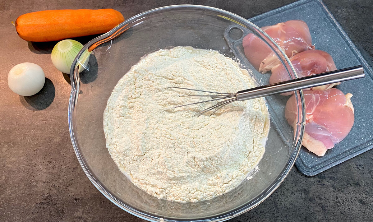 Для начала мешаем тесто, которое впоследствии станет основой для блинов. В то же время ставим варить мясо, например, куриное филе. Как только оно закипит, добавляем соль и перец, а затем продолжаем варить на умеренном огне около 30 минут.