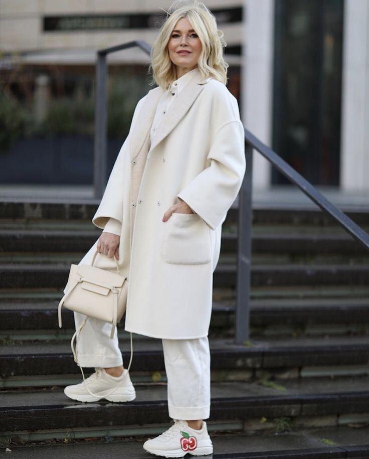 - Эффектный «тотал уайт». Белые свободные брюки или джинсы в сочетании с кофточкой на пуговицах и прямым пальто создадут стильный повседневный наряд. В завершение — обувь на небольшой платформе и аккуратная сумка.
