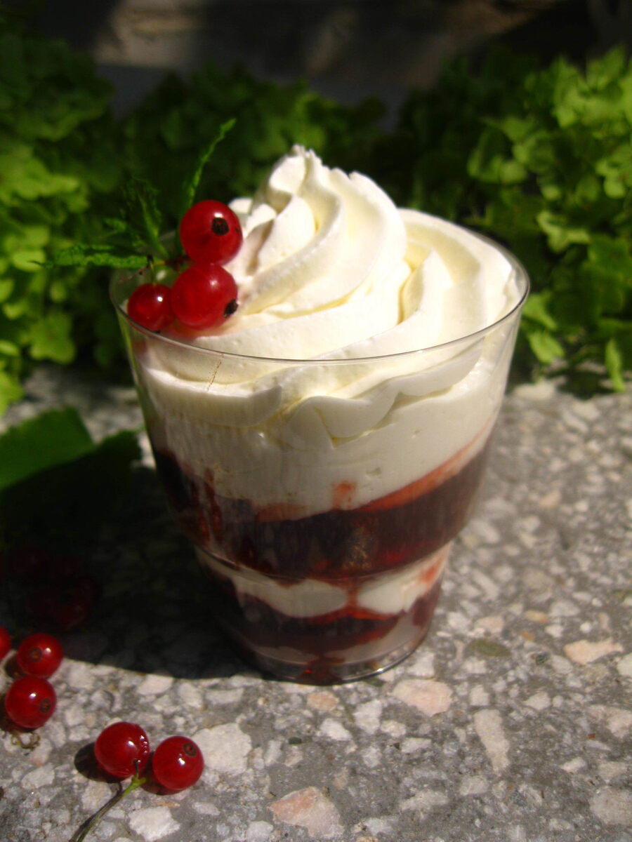 На бисквитный слой наносится смородиновый джем, далее с помощью кондитерского мешка или ложки равномерно распределяется крем. Можно повторять слои по желанию, а в конце их украсить красной смородиной и мятой. Наилучший вариант, чтобы все пропиталось — оставить десерты в холодильнике минимум на пару часов. В итоге получается удивительно вкусный трайфл!