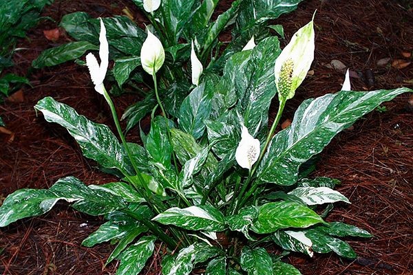 - Листья: овальные, с заострёнными концами, длиной до 25 см и шириной до 10 см. Основная окраска — насыщенно-зеленая с белыми вкраплениями.