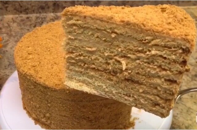 Сборка торта: Торт можно собирать как в кольце, заранее обложив его пленкой, так и просто на подставке. Прослаивайте кремом все коржи, обмажьте верх торта кремом и оставьте его в холодильнике на минимум 5 часов (желательно на ночь). Перед подачей посыпьте крошкой от одного из коржей сверху и по бокам. Нежный, ароматный и невероятно вкусный медовик готов к празднику!