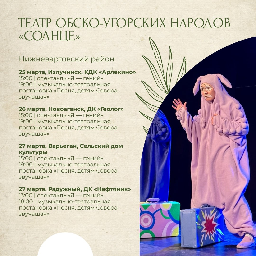В первый месяц весны югорские артисты подготовили насыщенную программу для детей и взрослых. Творческие коллективы отправятся в города и поселки округа, чтобы подарить зрителям новые впечатления и живые встречи с искусством. В программе — спектакли, выставки и мастер-классы.