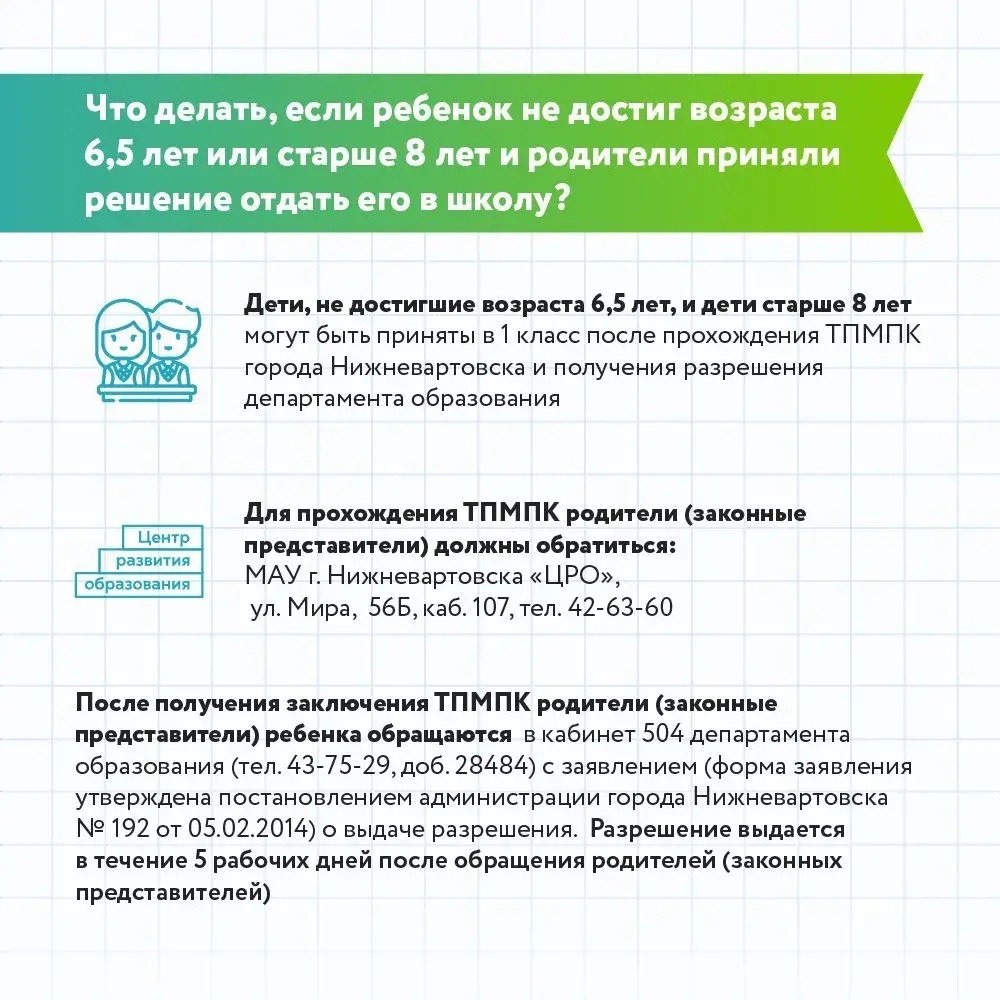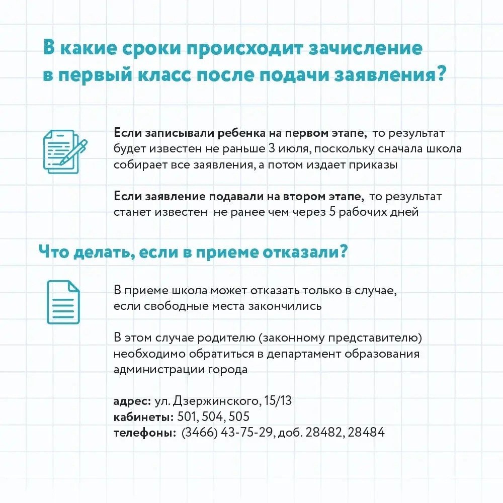 По вопросам приема детей в первый класс работает горячая линия в департаменте образования администрации города по телефону 43-75-29 (доб. 28482, 28484), в рабочие дни с 9 до 13 часов и с 14 до 17 часов.