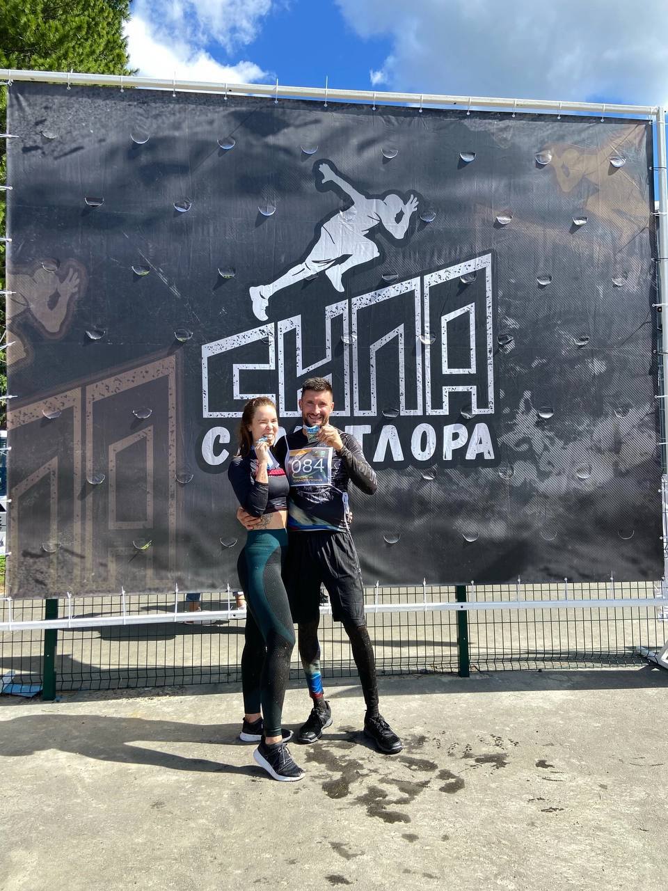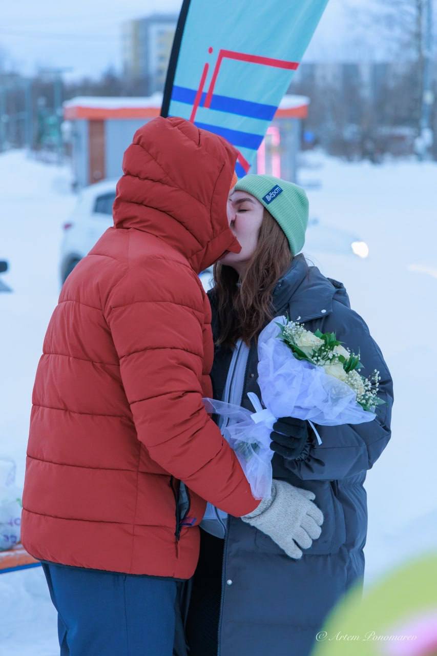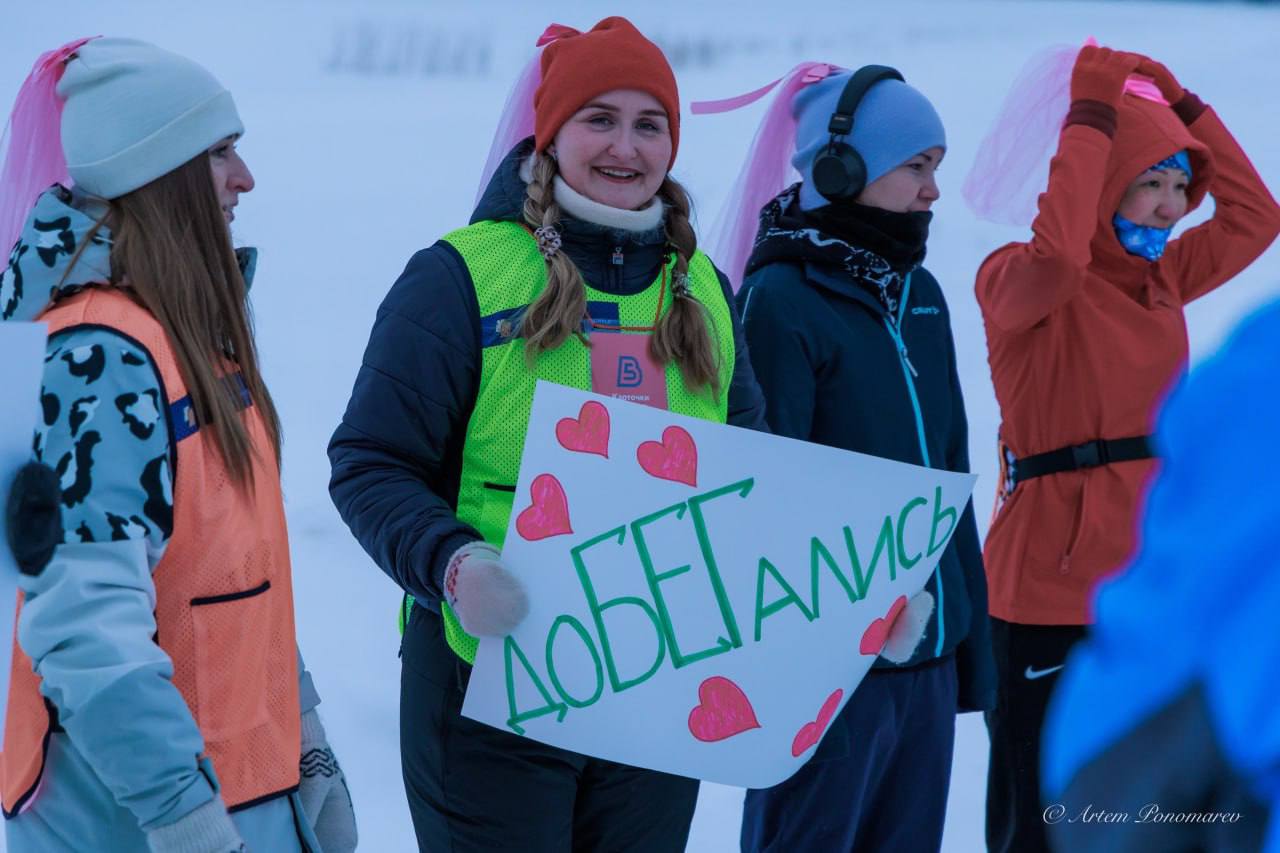 На следующий день молодоженов поздравили единомышленники на старте «5 верст» у Комсомольского озера: плакаты, каравай, подружки невесты. Елена пробежала дистанцию в 5 км и финишировала на руках мужа.