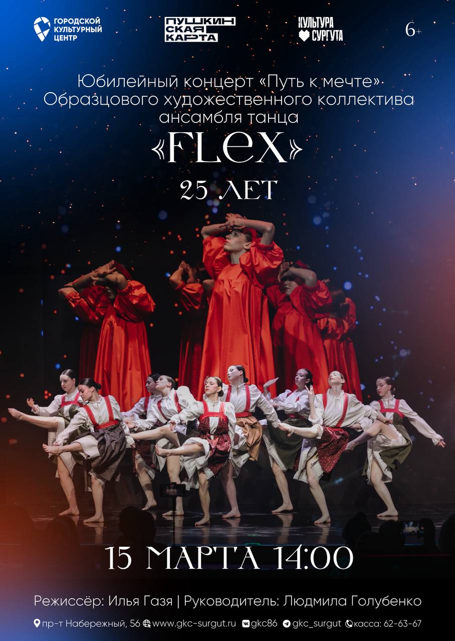 15 марта, 14:00 Юбилейный концерт «Путь к мечте» Образцового художественного коллектива ансамбля танца «Flex» (25 лет) в Городском культурном центре