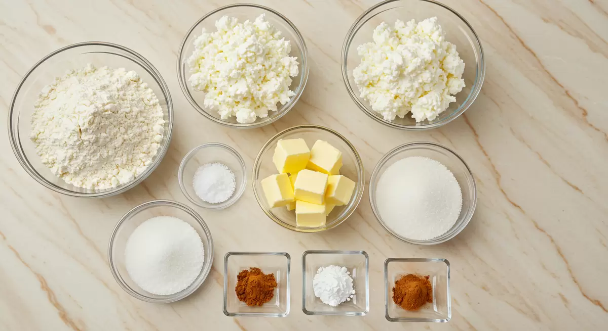 Творог (300 г, 5–9%) - выбирайте творог средней жирности. Он делает печенье мягким, а если попался зернистый, стоит его перемолоть до однородной массы.Пшеничная мука (265 г) - для лучшего результата, просеивайте муку дважды. Это поможет сделать тесто легким и воздушным.Сливочное масло (165 г) - используйте только охлажденное, нарезанное кубиками. Это придаст печенью рассыпчатую текстуру.Сахар (150 г) - можно экспериментировать с различными видами сахара, чтобы добавить особый оттенок во вкус.Ванильный сахар (10 г) - придаст аромат, возвращая в детство.Корица (1 ч. л.) - добавит уют и теплоту, можно экспериментировать с другими специями.Сода (0,25 ч. л.) - отвечает за легкость теста, но не добавляйте слишком много.Процесс приготовления: шаг за шагом